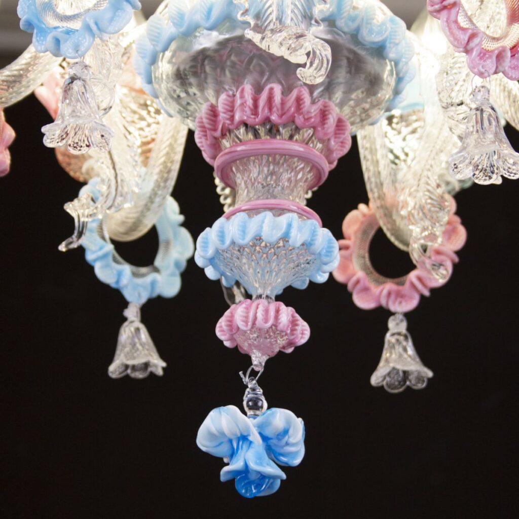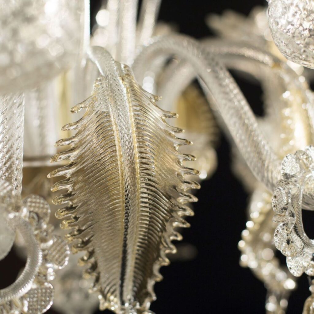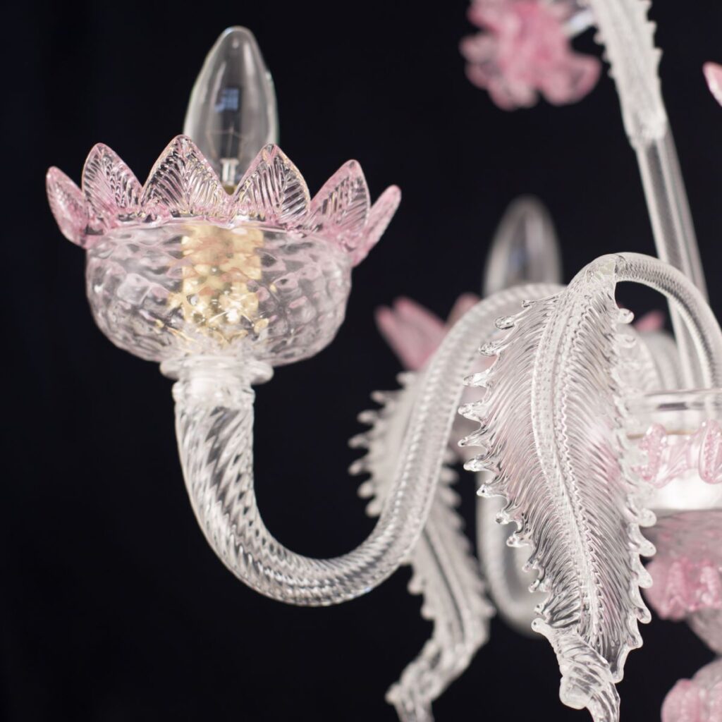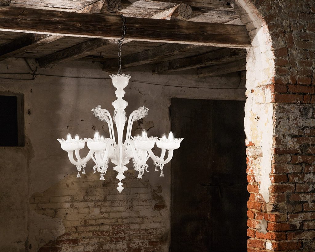 The V-Classic collection is a combination of elements, structures and shapes which are those typical of the venetian and Murano tradition. The structure is embellished by flowers, leaves, crests and “morrise” (a wavy decoration); the whole structure is something majestic, characterized by refined transparencies and delicate colours. The perfect solution to decorate elegant and valued spaces.