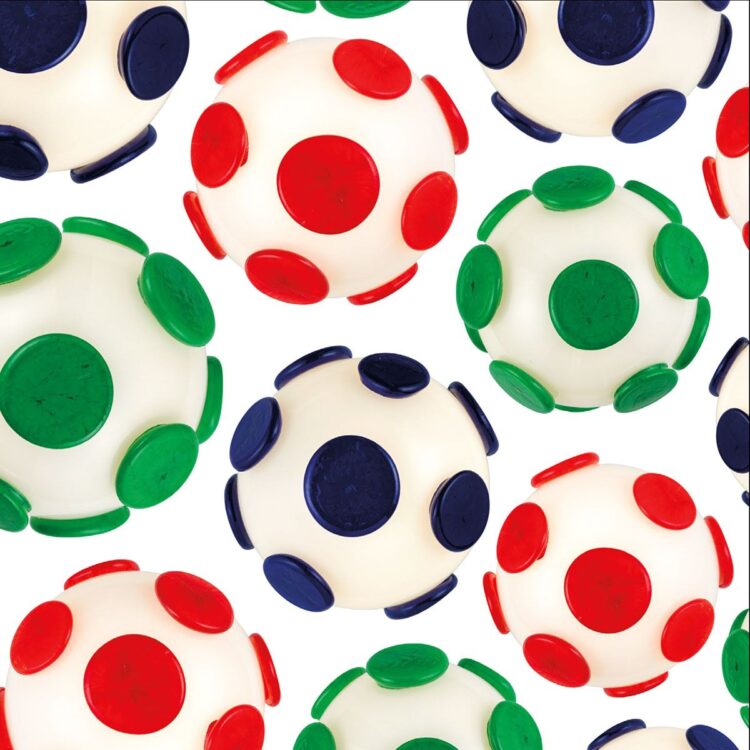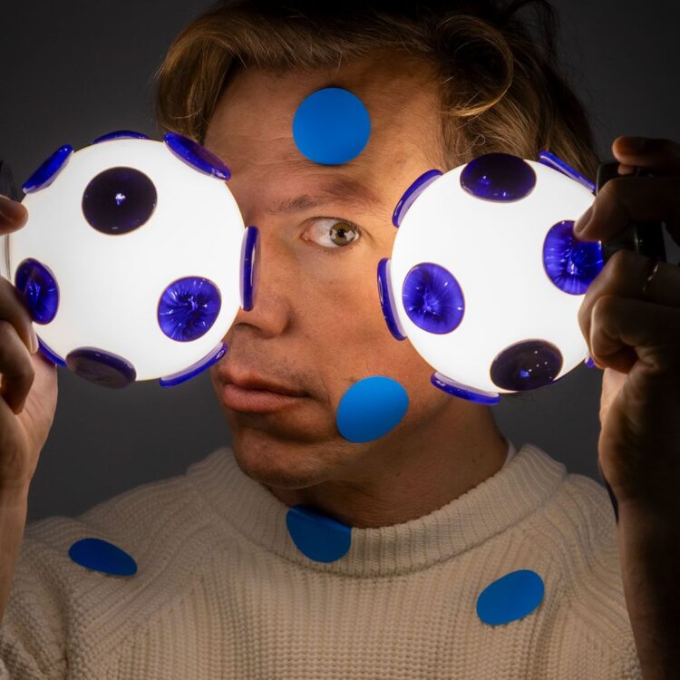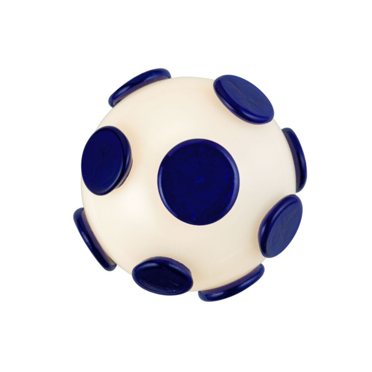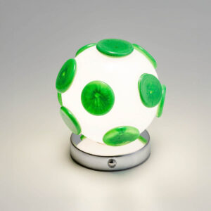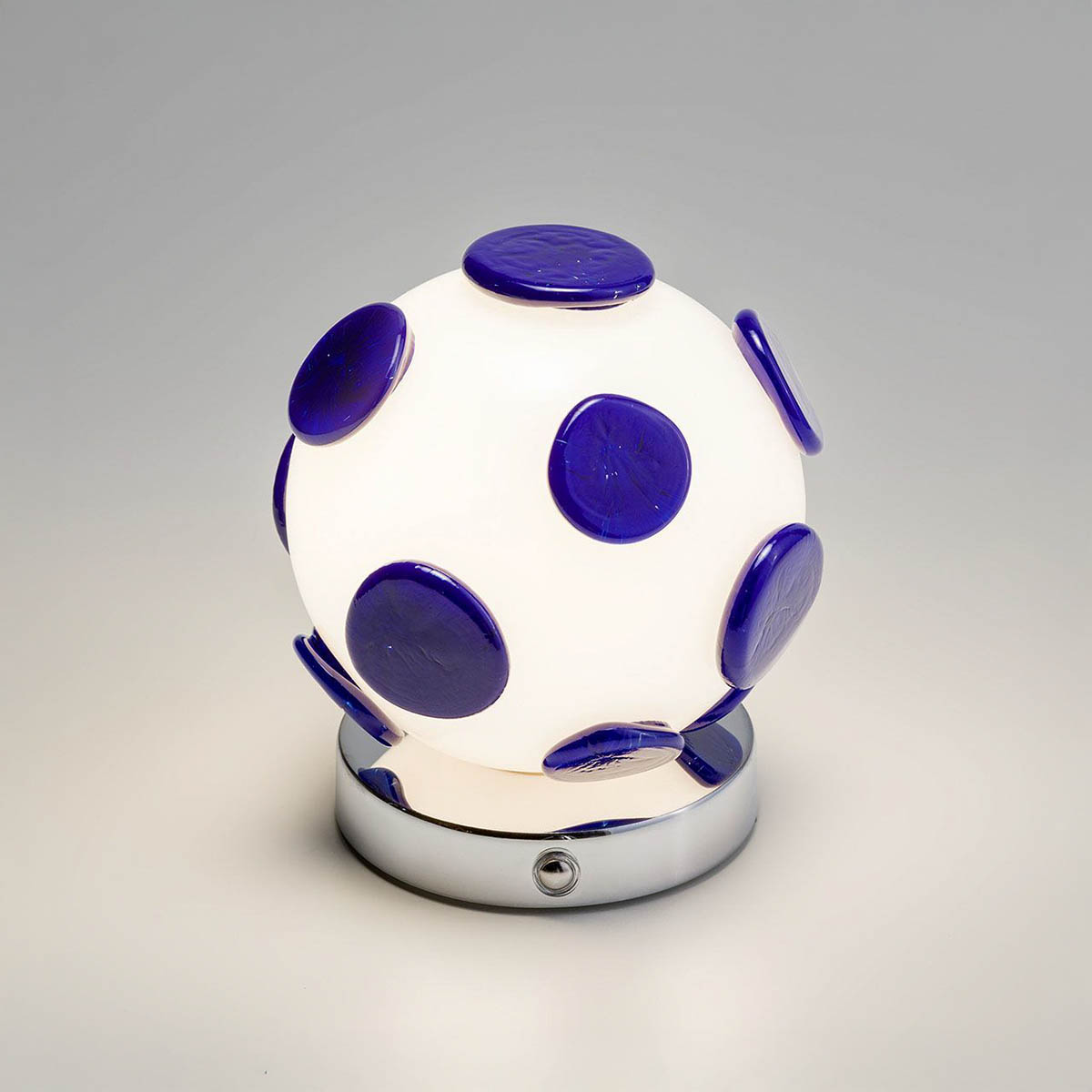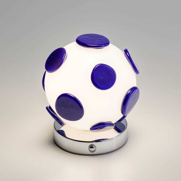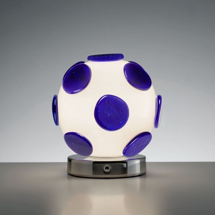 Pastiglie in vetro blu danzano sulla superficie di questa lampada in vetro soffiato bianco, evocando atmosfere cosmiche e visioni pop degli anni Sessanta. Grazie alla tecnologia a batteria ricaricabile, questa bolla luminosa diventa una presenza nomade: dimmerabile e leggerissima, si sposta agilmente per creare atmosfere intime e sofisticate.